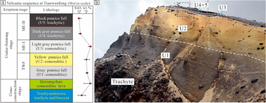 通过多次联合野外地质考察,厘定了长白山破火山口阶段火山喷发序列。即长白山破火山口阶段喷发主要由天文峰期(TWF)、千年大喷发第一期(ME-I)、千年大喷发第二期(ME-II)等三次中等-大规模普林尼式喷发构成(图1)。在野外地质研究基础上,利用包裹体温压计和矿物温压计估算岩浆驻留深度,结合地震、大地电磁成像,提出长白山破火山口阶段存在由浅部岩浆房(埋深0.5-3 km)、中地壳岩浆房(埋深10-15 km)和壳幔边界残留基性岩浆房(40 km左右)构成的复合岩浆房系统(图2)。进一步根据主微量元素和Sr-Nd同位素分析结果,区分出三条岩浆演化路径。结合岩石学、矿物学分析,认为天文峰期和千年大喷发第一期的碱流质浮岩喷发由浅部岩浆房系统控制,中地壳岩浆房起到了岩浆补给站的作用,即浅部岩浆房中碱流质岩浆均继承自中地壳岩浆房中造锥期残留的粗面质岩浆,为粗面质岩浆向碱流质岩浆演化后,上升并注入到浅部岩浆房逐渐聚集形成。而千年大喷发第二期粗面质浮岩则直接来自破火山口阶段中地壳岩浆房中新注入的粗面质岩浆。