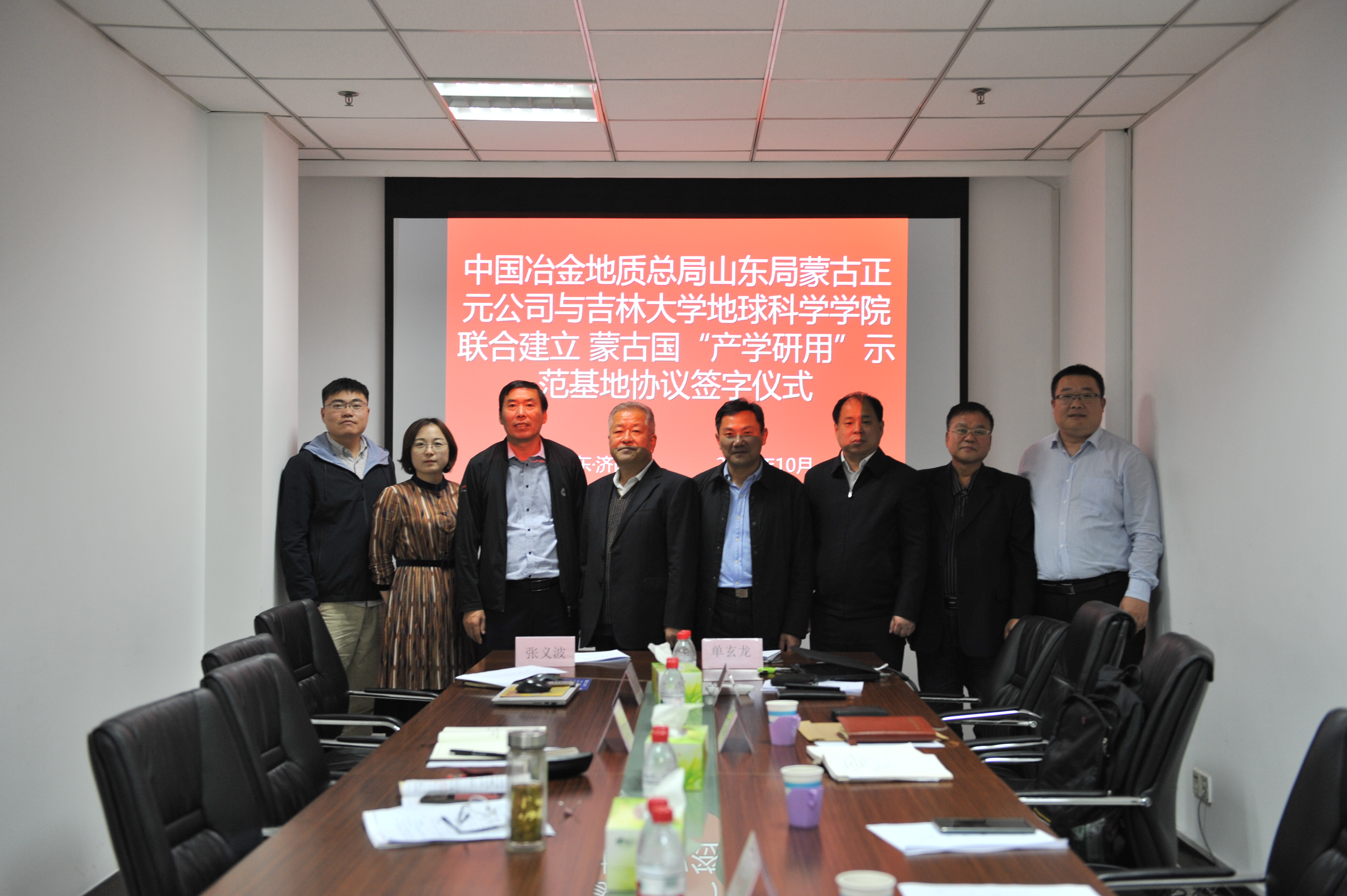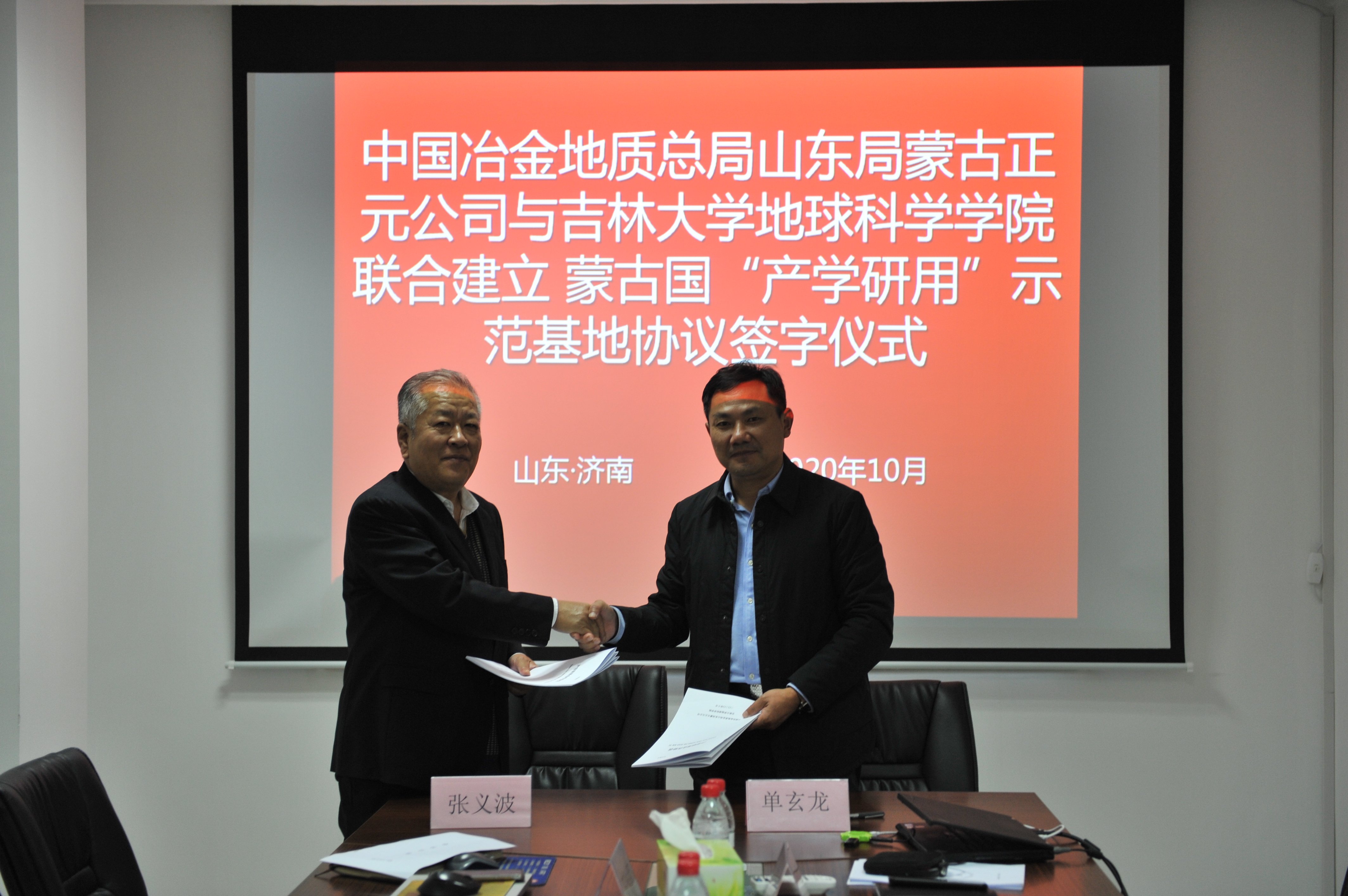 2020年10月16日,9428cn太阳集团古天乐经理单玄龙、党委书记杨洲等一行三人到蒙古正元公司进行交流座谈,双方就人才培养、联合立项、地质成果研究等多个方面展开讨论并达成共识。会间,双方签署了共建蒙古国“产学研用”示范基地协议。山东局地质科技部副主任谭延斌、蒙古正元公司总经理张义波等出席会议。