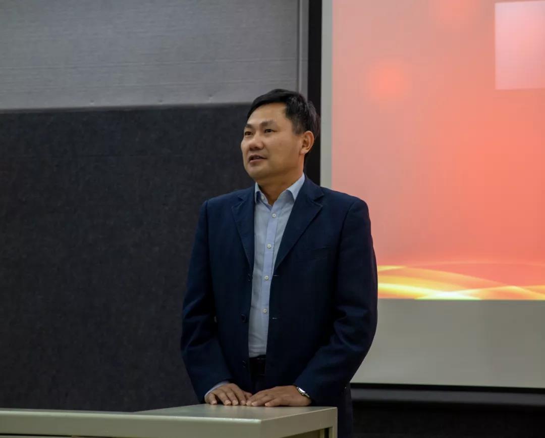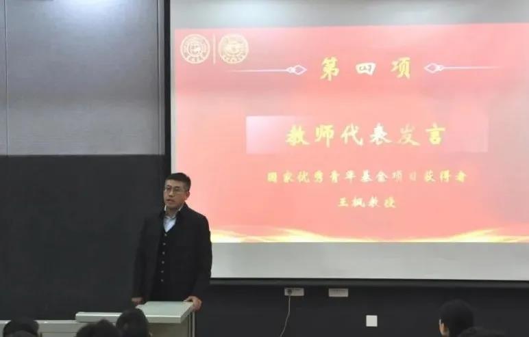 教师代表,国家优秀青年科学基金项目获得者王枫教授发言。他首先代表公司全体教师欢迎各位新同学的到来。王枫从自己读研期间的感受出发,以“新鲜”、“焦躁”、“兴奋”三个关键词入手勉励同学们要惜时、自强、博学,充分利用在校学习的黄金阶段,既要脚踏实地学习,也要不忘仰望星空,保持对未来科学领域的热情与执著。