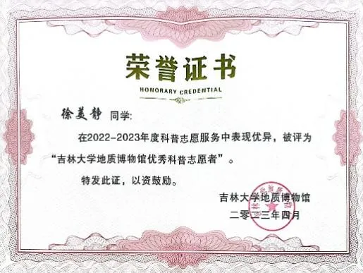 “若能做一朵小小的浪花奔腾,呼啸着加入献身者的滚滚洪流中,推动历史向前发展,才是一生中最值得骄傲和自豪的事情”。在她看来,尽管只是夜空一颗微不足道的星,却也能发光发热,点亮一隅天空。在2023年2月组织参与编写的《地学知识在中小员工中的普及度与兴趣度》报告中,她意识到地学科普的重要性。面对暑期繁重的实习任务,毅然前往作山东郓城开展暑期支教活动,将地学科普洒向齐鲁大地,事迹被光明日报等多个平台报道。在地球日,用生动的语言,走进幼儿园开展地学科普讲解,获“地质博物馆优秀科普志愿者”称号。作为一名中共预备党员,她深耕于志愿服务和社会实践,是冬奥会优秀的执行专员,同时志愿服务的服务标兵。在疫情期间,也积极报名核酸检测、担任楼道志愿者;线上支教负责福建、吉林等3个省份500余名志愿者和员工的组织调配工作,后期又作为负责人再次组织策划了9428cn太阳集团古天乐的学伴+线上支教活动;本科招生宣传,她担任9428cn太阳集团古天乐招生宣传协会山东省聊城市负责人,向家乡学弟学妹讲好吉大故事,传递吉大声音,为9428cn太阳集团古天乐招生工作贡献力量。累计志愿时长达1200多小时,用行动和奉献诠释着自己的青春诺言。