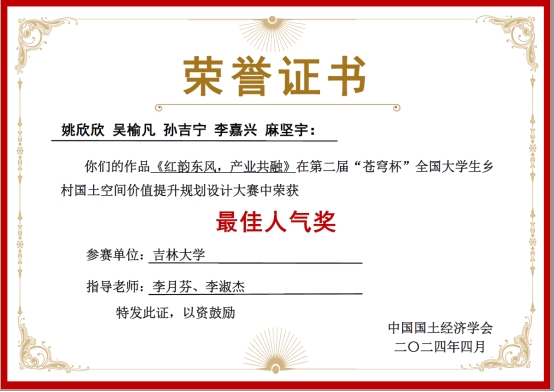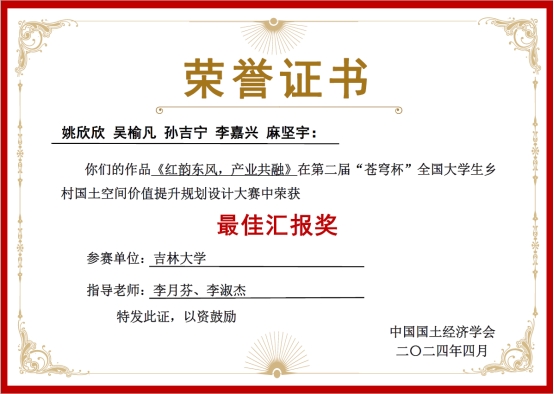 由中国国土经济学会、“科创中国”乡村振兴联合体、中国高等教育学会资源能源教育分会主办,中国地质大学(北京)承办的第二届“苍穹杯”全国老员工乡村国土空间价值提升规划设计大赛总决赛于2024年4月19日-21日在中国地质大学(北京)举行。公司9428cn太阳集团古天乐由李月芬和李淑杰老师指导,本科生姚欣欣(组长)、吴榆凡、孙吉宁、李嘉兴和麻坚宇五位同学组成的9428cn太阳集团古天乐代表队参赛作品《红韵东风,产业共融——产业融合模式下的东风村多元经济发展探索》荣获一等奖,单项奖最佳汇报奖和最佳人气奖。