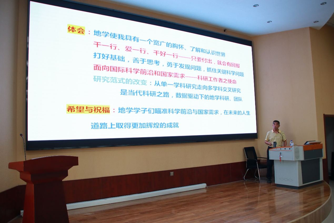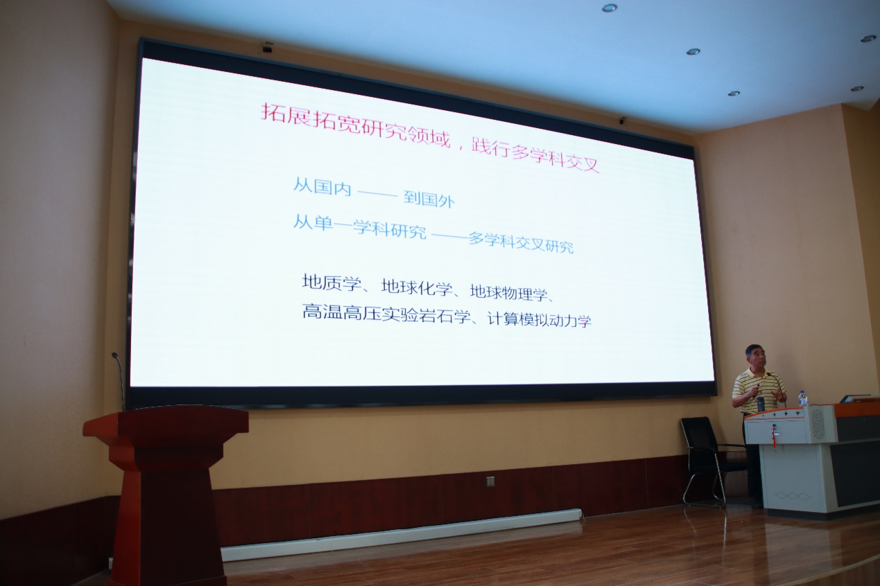 报告会上,许文良教授结合他国内国外的求学之路、国际会议的参与过程和丰富的野外实践经历,开拓了员工的国际视野、激发了员工的专业兴趣。许文良教授鼓励专业的交流融合,他自己兼修人文与经济管理专业,其在管理方面也具备深厚的知识储备。之后,许教授以地球深部水-碳循环及其效应为例,既向大家展示了吉大地学的优势所在,又充分体现“地球系统科学”这一21世纪的重要地学命题,强调各圈层的相互作用,并延展出深部运动对地表环境宜居性的影响。最后许文良教授以“地球深部动力学创新团队”的创立为例,强调吉大师生应当拓宽专业研究领域,践行多学科交叉融合,提升员工们的专业素养。许文良教授在报告过程中谈到自己在阿曼地区观察到出露良好的蛇绿岩套及其上部覆盖的枕状玄武岩时,兴奋与喜悦之情溢于言表,许教授对于地学真挚的热爱感染着报告厅里的每一个人。