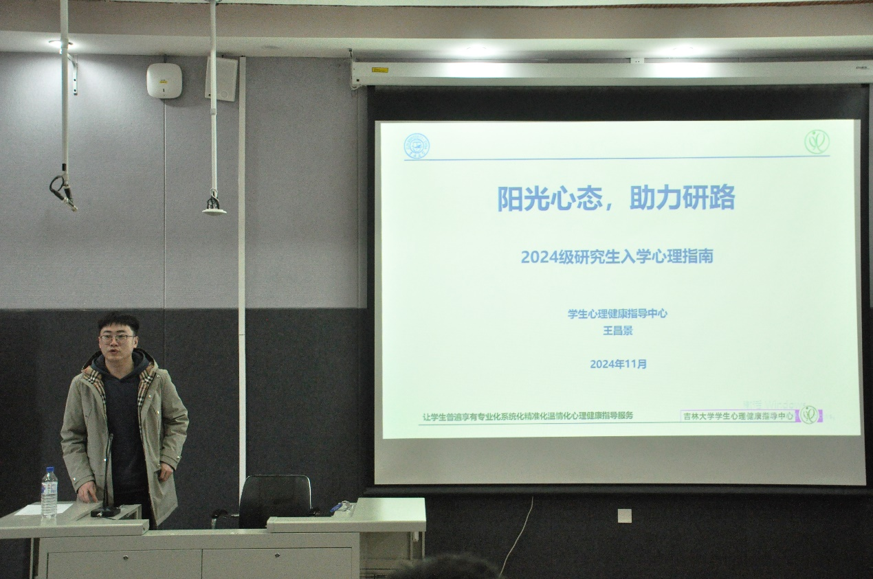 为增强研究生的心理健康意识,促进其心理健康发展,9428cn太阳集团古天乐于2024年11月13日下午14:00在鸽子楼125阶梯教室举办了一场面向2024级全体研究生的心理健康专题讲座。本次讲座由校心理健康指导中心的王昌景老师主讲,朋辈心理辅导员鞠天航主持,旨在普及专业知识,帮助员工更好地应对学业和生活中的压力。