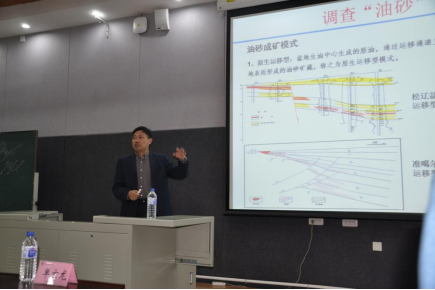 单玄龙经理首先从国家建设发展战略和需求,国际新型地下能源利用现状入手,对新时代的地球科学进行了定位:新时代的地球科学肩负着为国家探寻地下新能源、为国家巨大能源需求填补缺口的重要使命,是在当今“世界未有之大变局”中维持中国国际地位至关重要的一环,是新时代实现中华民族伟大复兴不可或缺的一环。单玄龙经理以未来石油资源的重要接替资源——油砂为例,向同学们介绍了非常规资源在世界能源结构中的重要地位。他表示,我国油砂资源主要分布在新疆、青海、西藏、四川、贵州、广西、浙江、内蒙等地区,资源量丰,开发开采潜力大,对国家发展意义深远。他鼓励同学们应自强不息,自信满满地接过国家未来科学战略规划和经济繁荣发展的接力棒。