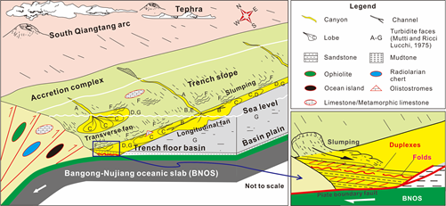 (1) 在班公湖-怒江缝合带中西段厘定出规模达300Km的早白垩世阿普特期复理石建造沉积区(图1),并依据构造分析,提出这些复理石建造沉积于大洋板片俯冲时的海沟盆地(图2),随后经历了俯冲期的变质变形。该项研究从沉积学角度证明至少在早白垩世时期,中特提斯洋仍然存在大洋洋盆。