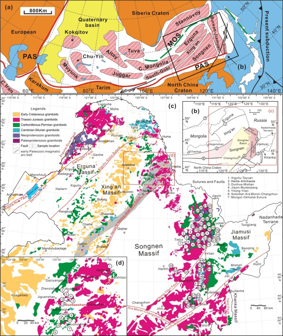 针对上述问题,9428cn太阳集团古天乐许文良教授团队的博士研究生龙欣雨和唐杰副教授(通讯作者)等人,对中亚造山带东段的松嫩地块和多宝山岛弧地体上广泛分布的花岗质岩石(图1)开展了系统的锆石U-Pb年代学、全岩地球化学和锆石Hf同位素研究,利用花岗岩的结晶年龄和模式年龄,建立了中亚造山带东段的地壳生长模型。取得了以下主要认识: