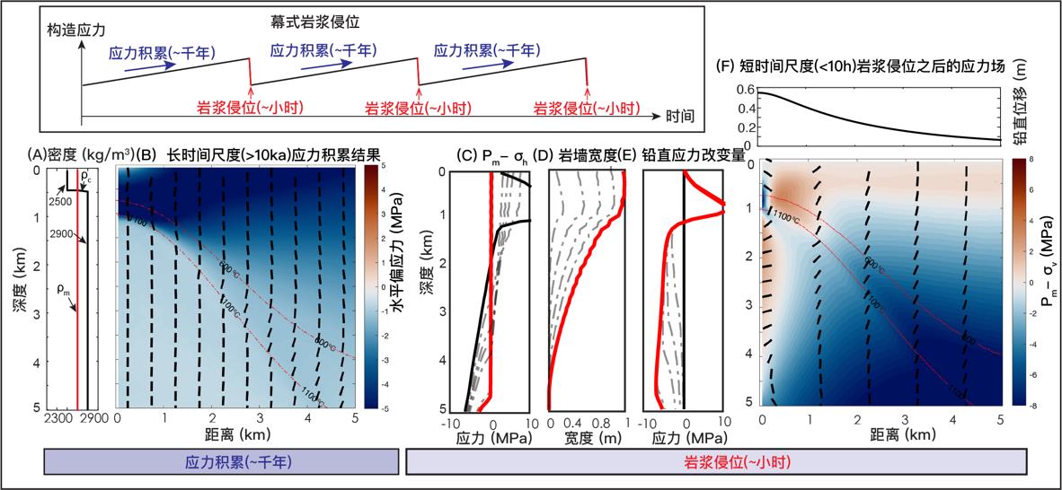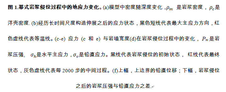 1)通过耦合模拟长时间尺度(~千年)的构造伸展和短时间尺度(~小时)岩浆侵位发现:岩墙侵位到一个已经被伸展的脆性岩石圈可以导致大洋地壳发生小幅度的挠曲和铅直方向的位移。这种位移导致了铅直应力的减小和主应力方向的旋转, 从而有可能为AMLs内部的水平岩浆侵位提供了合适的应力环境(图1)。
