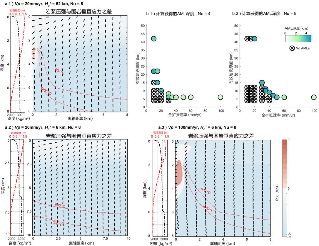 图2. 不同扩张速率下AMLs形成所需的应力环境。(a)三个不同扩张速率及有效洋壳厚度的案例中,一次岩墙侵位对地应力的影响。岩浆压强与围岩垂直应力大于0则表示有利于AMLs 的形成。(b)系统地显示了扩张速率和洋壳厚度对AMLs形成深度的影响。