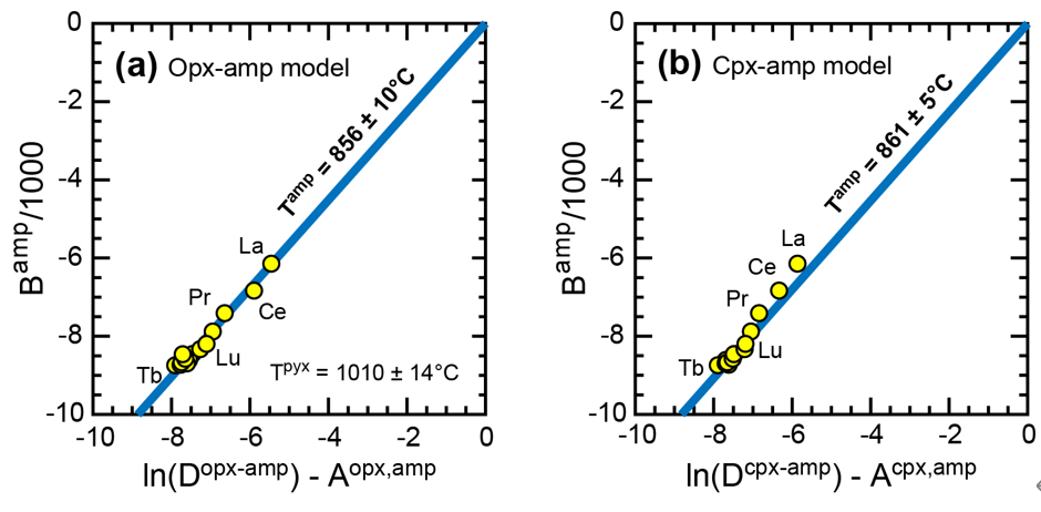 2. 利用以上模型,可以通过角闪石和辉石的主量元素和REE成分反演角闪石的结晶温度(图1)。与已有的角闪石温度计相比,该REE温度计可以更好地表征含水熔体交代岩石圈地幔的温度。