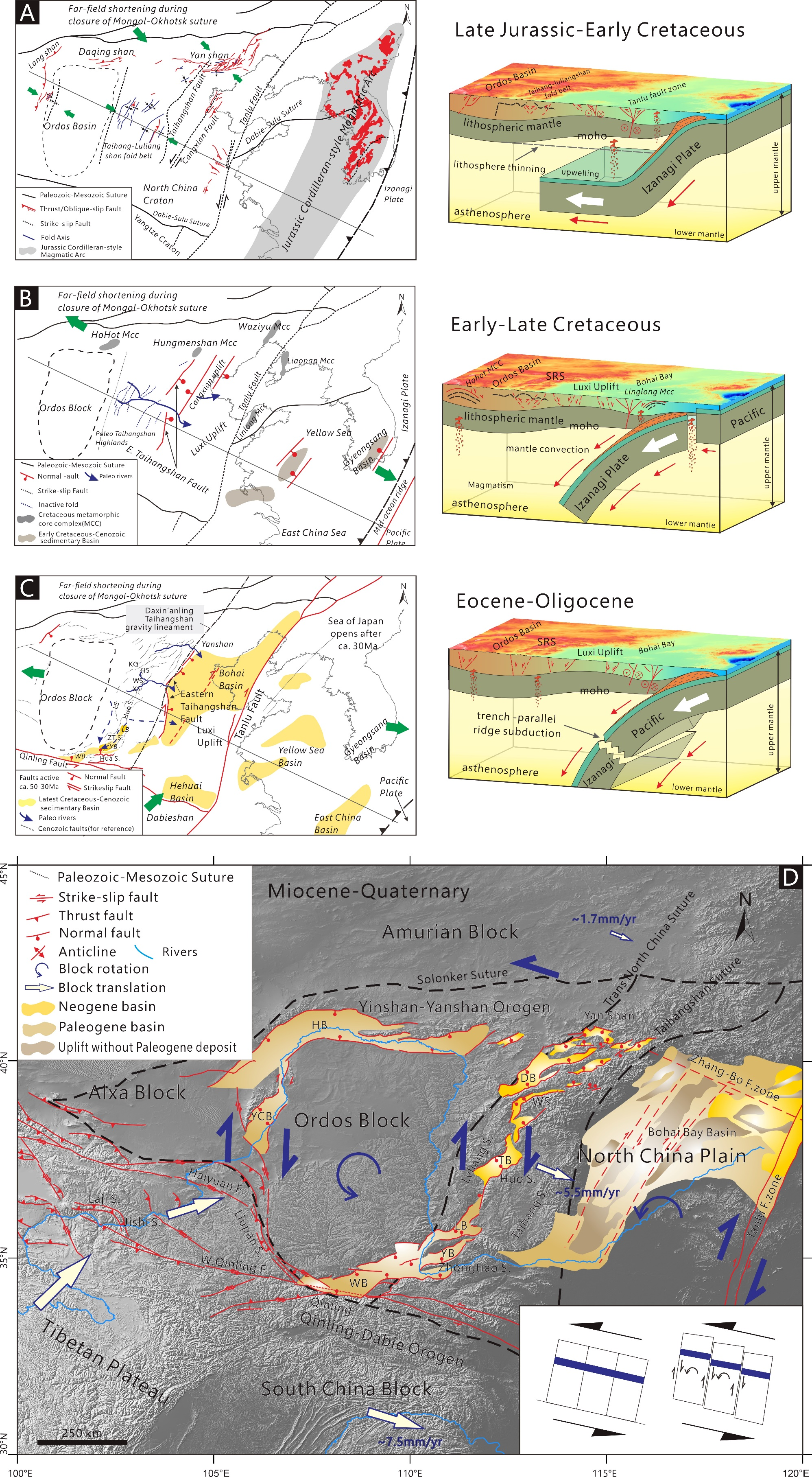 2. 确定了山西裂谷系的构造演化过程:讨论了板内挤压与伸展的构造驱动因素,包括晚侏罗世—白垩世期间Izanagi板块向欧亚大陆的俯冲导致华北克拉通的挤压和后续的伸展(图5)。在始新世—渐新世,印度与欧亚板块的碰撞和太平洋板块的俯冲回退共同影响了区域的伸展。在中新世,青藏高原的隆升和太平洋板块的后撤进一步影响了山西裂谷系的剥露和伸展。