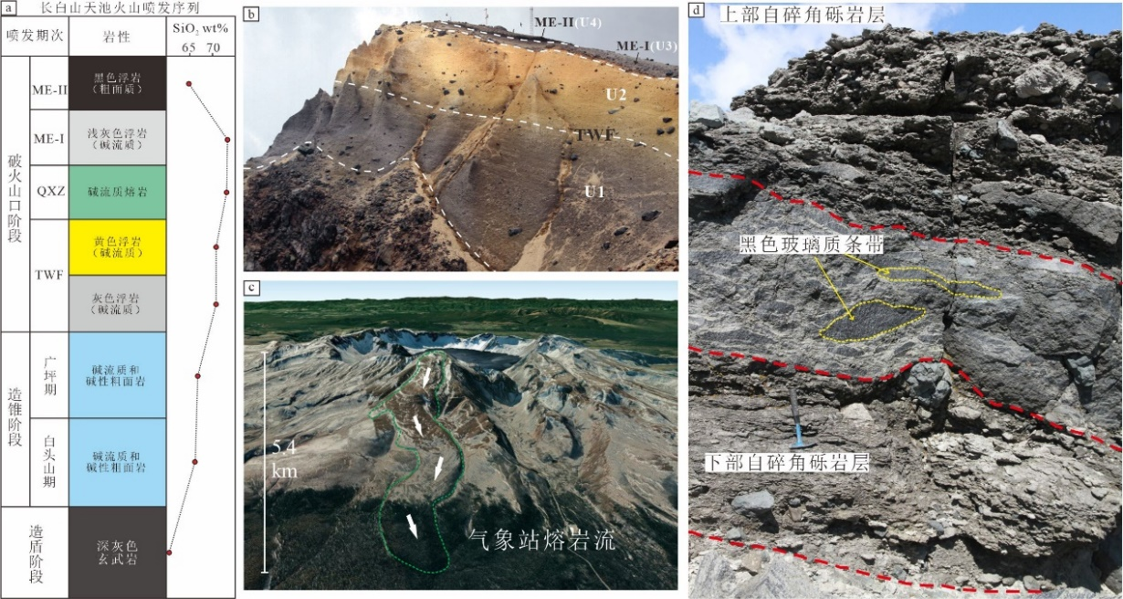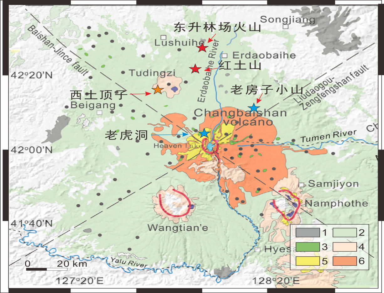 长白山火山是我国规模最大、最具喷发危险性的活火山,公元946年发生的长白山千年大喷发(Millennium Eruption)被认为是全球两千年来最大的喷发事件之一;同时,长白山也是我国唯一的一座由多旋回、多期次喷发形成的大型复合层火山,包括造盾、造锥、破火山口和后破火山口多个喷发阶段(图1)。长白山不同喷发阶段形成的多期火山喷发物,蕴含着火山深部岩浆系统形成与演化的宝贵信息,是揭示新生代欧亚大陆东缘大地幔楔控制下板内火山深部岩浆系统结构及岩浆过程的关键线索。