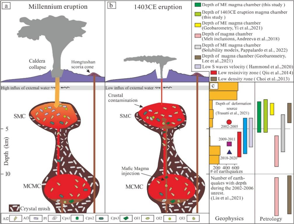 3.建立了长白山后破火山口阶段岩浆房系统地质模型,并恢复了岩浆过程,对预测火山喷发具有重要理论意义。长白山千年大喷发之后的后破火山口阶段发生了多次小规模喷发作用(公元1265年、公元1373年、公元1668年、公元1702年和公元1903年小规模喷发),它们由千年大喷发岩浆房坍塌破坏后的残留岩浆系统控制。在1403年喷发事件中,喷发的岩浆主要为浅地壳岩浆房(埋深1.9至5.4 km)中残留的千年大喷发第II期粗面质岩浆。粗面质岩浆在岩浆房中经历了分离结晶作用,并与深部补给的玄武质岩浆发生了混合,深部玄武质岩浆的突然注入是主要触发机制(图4)。近期的高精度地震、重磁探测以及气体、地震监测显示,长白山浅地壳岩浆系统仍然活跃,长白山具有再次喷发的危险性。