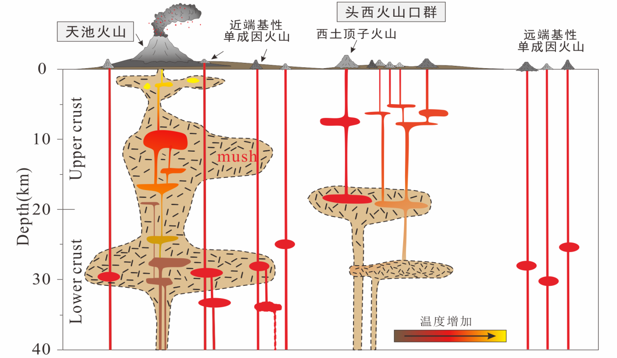 1、刻画了长白山造锥阶段基性岩浆系统:长白山造锥阶段除了粗面质主火山锥体外,还形成了200余座单成因火山,可分为基性单成因火山和中性单成因火山两类。长白山由造盾阶段进入造锥阶段后,火山群下方的岩浆系统发生了演变。纵向上,原有的天池火山岩浆系统不断向浅部延伸,形成了位于上地壳内不同深度的多个中酸性岩浆房;横向上,在天池火山岩浆系统的周围,小规模基性岩浆在下地壳中形成了多个“新的”小体积岩浆房,每座基性单成因火山下方至少包含一个位于下地壳岩浆房,中性单成因火山则具有下地壳和上地壳双岩浆房系统(图2),这些小体积性岩浆房供应了天池周围基性和中性单成因火山活动。