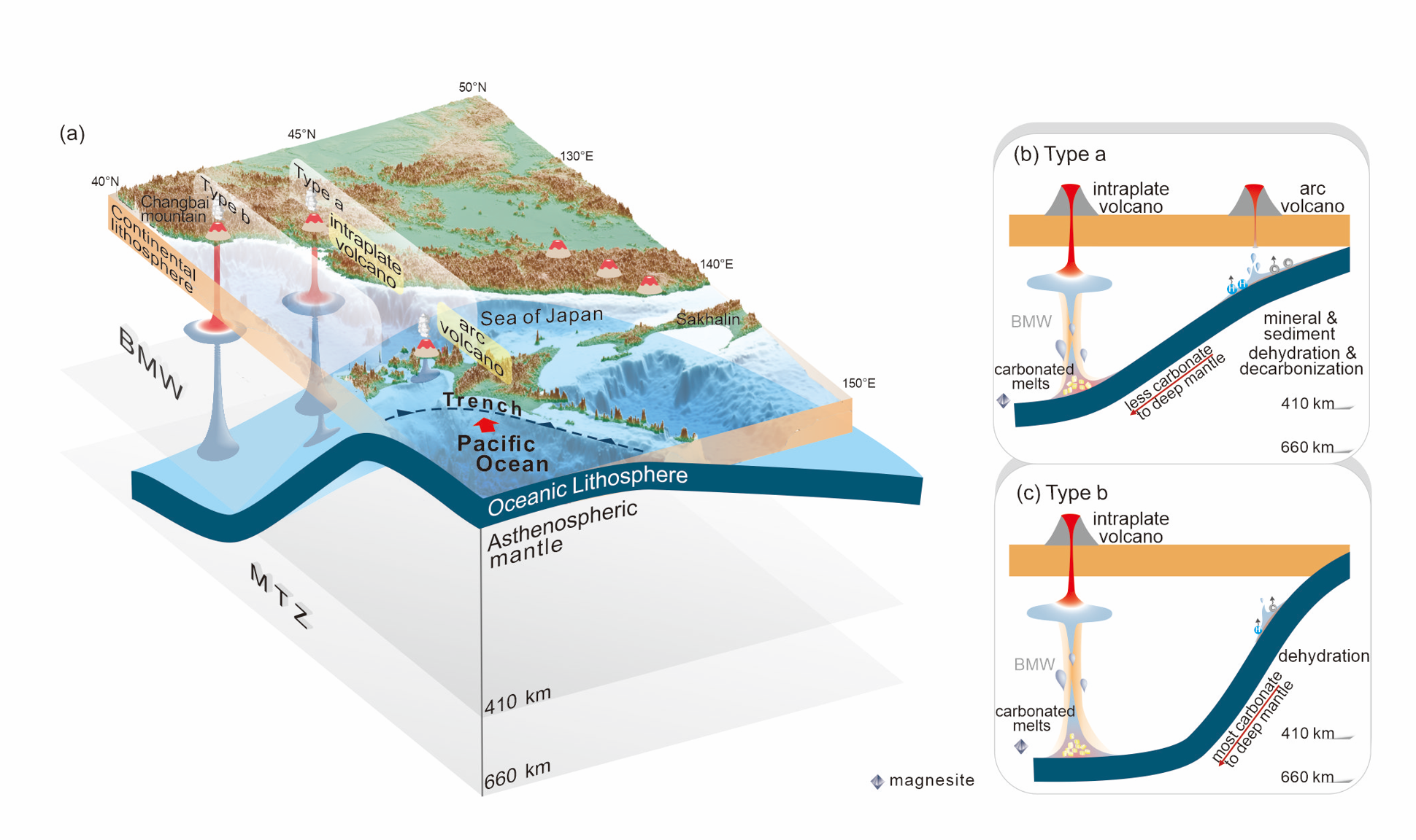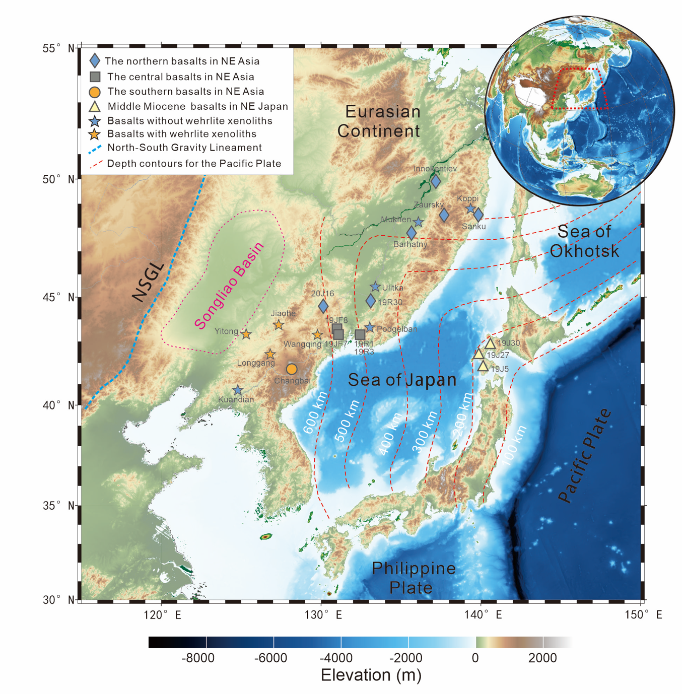 针对这一关键问题,公司许文良教授引领的“9428cn太阳集团古天乐地球深部动力学创新团队”联合中国地质大学(北京)刘盛遨教授,对东北亚陆缘、平行于俯冲带分布的中新世板内玄武岩开展了系统的Mg-Zn同位素研究(图1),结合东北亚陆缘新生代玄武岩中地幔捕虏体的空间分布和地球物理观测资料,为单一俯冲带小尺度碳输入的三维空间变异提供了关键证据。具体研究成果如下: