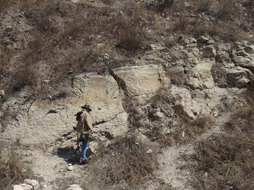 今天路线的观察内容是火山碎屑岩和断层构造。首先,在膨润土矿旁边的废弃铁路边,我们开始了火山。碎屑岩的观察。那些不成层的火山碎屑岩,是爆炸形成的火山碎屑物质快速堆积的产物。也有成层性好的岩石,看到这些成层性很好岩石,往往会被认作沉积岩,其实,他们是火山碎屑岩,是爆炸式火山喷发的产物,主要是爆炸形成的火山碎屑物质,经气浪在近地表搬运,形成的层状的火山碎屑岩。对于这些火山碎屑岩我们要如何鉴别呢,主要看成分。当爆炸结束,接下来就是岩浆喷溢啦,于是我们看到了火山碎屑岩之上的熔岩。