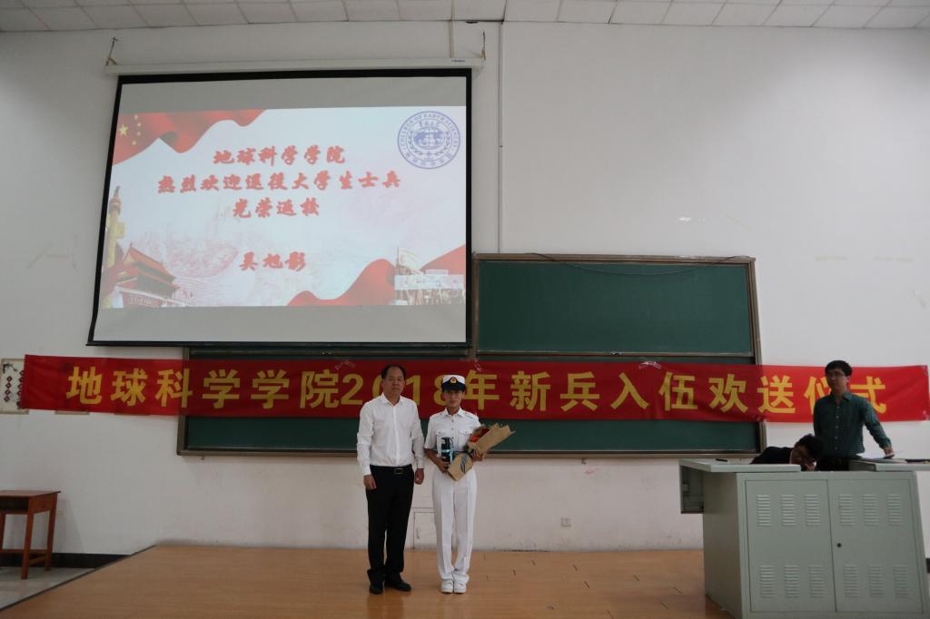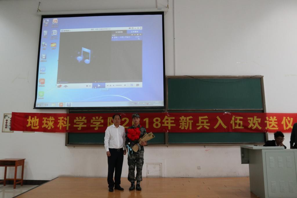 首先,杨洲书记为应征入伍的新生——2017级资源勘查工程的胡嘉诚同学佩戴了“光荣入伍”的大红花及纪念品。希望他在军营中磨砺自己,刻苦训练,为国家、为公司争光。