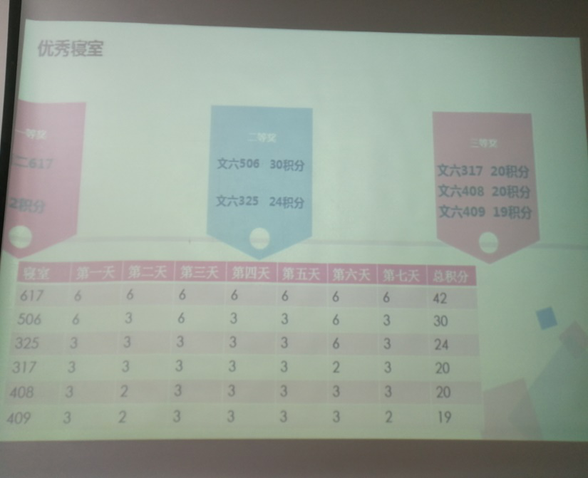 员工会工作人员早早到达教室,为接下来会议的召开做准备,十八点三十总结大会正式开始。首先由员工会生活部部长常磊为大家总结了此次活动的收获,接下来为同学们展示了表现突出的优秀寝室的照片。此次活动中南苑二公寓617宿舍获得一等奖,文苑六公寓506、325宿舍获得二等奖,文苑六公寓317、408、409宿舍获得了三等奖。最后常磊同学对获奖寝室提出了表扬,并为他们颁发了奖品与荣誉证书。