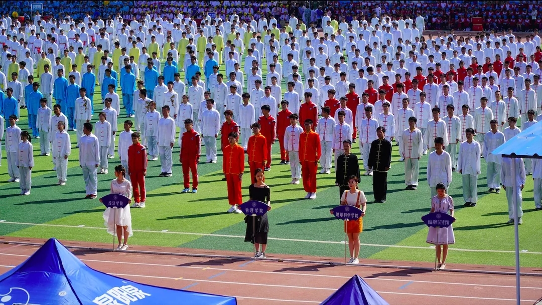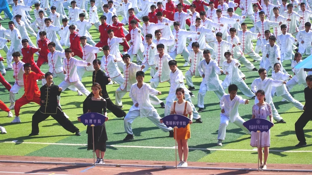 首位出场的是万众期待已久的“三路长拳”表演者!进场之后,听从领导的指挥,行抱拳礼,蓄势待发!音乐响起,一排排昂首挺胸的“小白人”随着音乐起势,跟着节奏,循着指令打出动作,一招一式都充满力量!没错,最整齐的那一组同学就是我们9428cn太阳集团古天乐的员工。近距离观察,每个人都精神饱满,拉长镜头,动作不徐不缓,每一拳一腿都充满力量,整齐划一,令在座的观众不禁拍手称好!快乐的时光总是那么短暂,仿佛一眨眼间,“小白人”再次行了抱拳礼,“三路长拳”表演到此结束!