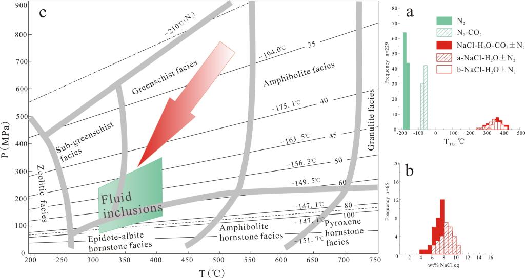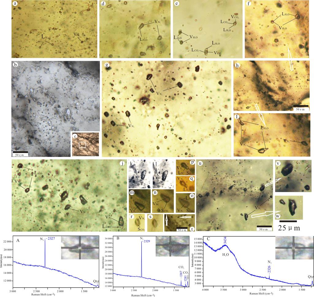 包裹体岩相学研究表明,矿石石英中发育气相、富气相、含CO2及气液两相四种类型原生流体包裹体(图1),根据测温过程中包裹体复杂的相变特征、相变温度(图2)及单个包裹体激光拉曼光谱成分分析(图1),证明成矿流体为一类成分复杂的富N2流体体系,各类包裹体中N2及CO2含量变化大(图3),排除了不同类包裹体为原始均匀流体不混溶作用结果的可能性;结合氢-氧-氮同位素分析结果,提出成矿流体为岩浆来源NaCl-H2O-CO2体系热液与变质富N2流体混合产物的新认识。成矿流体中大量N2气的加入,有力促进了白钨矿的沉淀,是白钨矿矿床形成的重要机制。