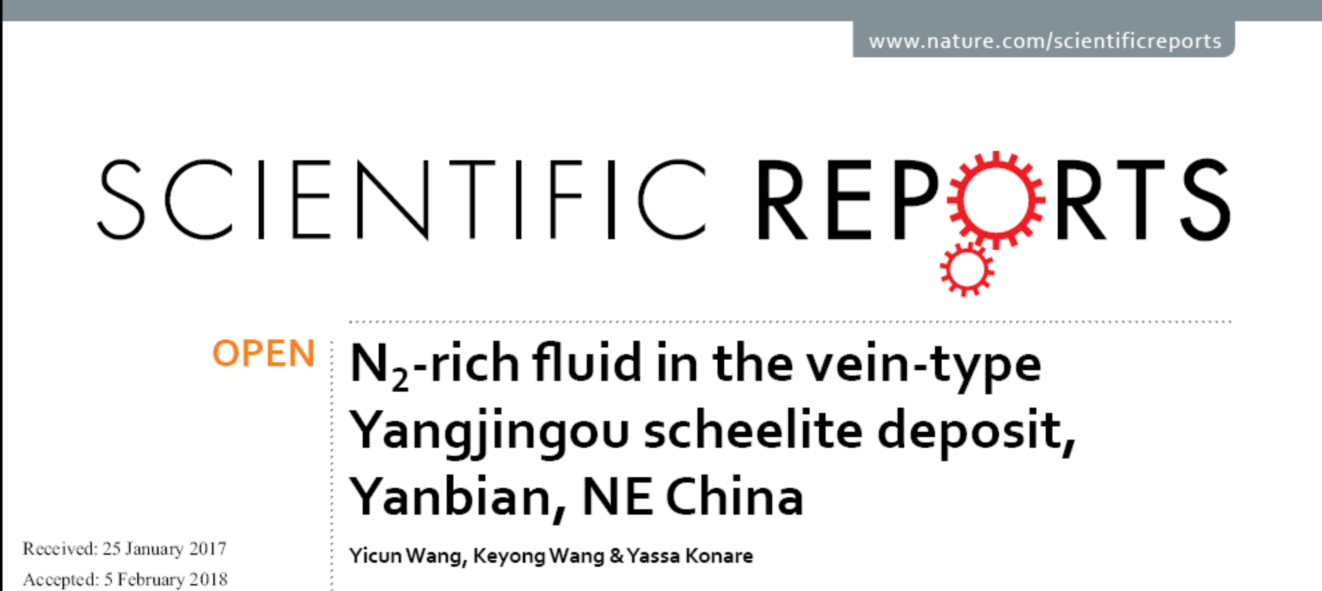 以上研究成果在线发表在Nature旗下子刊Scientific Reports (Wang et al. N2-rich fluid in the vein-type Yangjingou scheelite deposit, Yanbian, NE China. Scientific Reports, 2018, DOI:10.1038/s41598-018-22227-7)